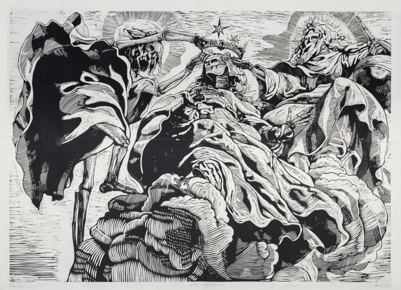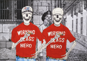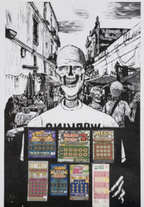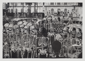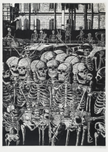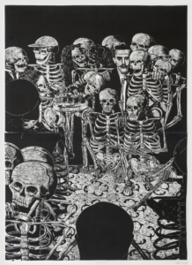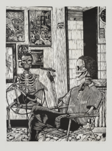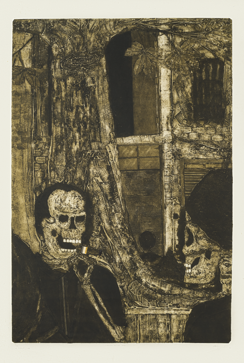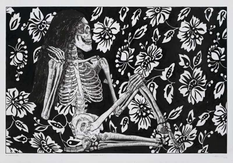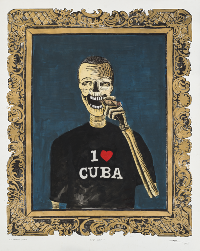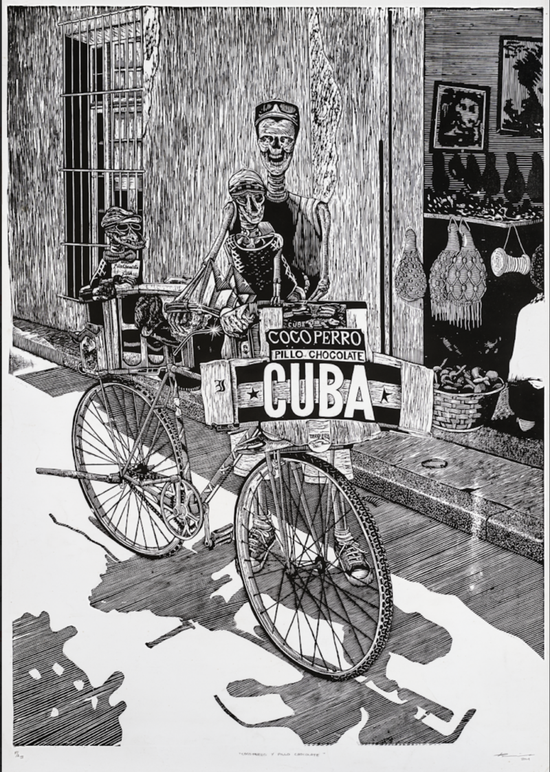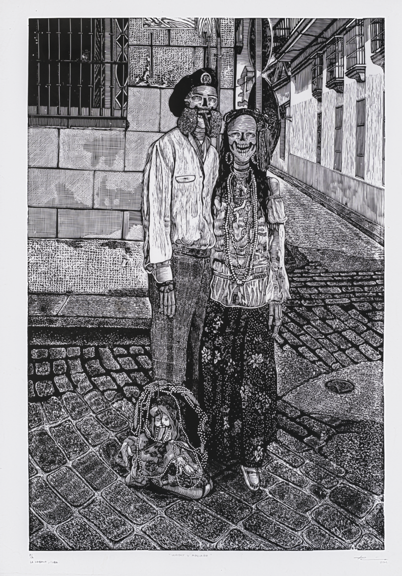 Julio Cesar Peña, Holguín, Cuba. 1969 Julio Cesar Peña, is a well-known Cuban engraver with almost self-taught training who has particularized his work with the recurrent use of skulls, not as an ode to death but quite the opposite, his skulls are his everyday beings loaded with humor, with vices. and customs, according to the author himself; << …My works are not about death. They are about life. They are about the act of seeing ourselves. They are like seeing life through an x-ray. We are all the same anatomically: what makes us different is the costume that is imposed on us when we are born.>> Peñita’s Work, as it is recognized, reaches its splendor in 1997 with the mention received at the event for young engravers Latin Americans, organized by Casa de las Américas, then he began to work at the Experimental de Gráfica workshop in Havana, received the La Joven Estampa Award in 1999 and then in 2001 he was internationally recognized with the Grand Prize at the Engraving Triennial of the Japanese city of Kanagawa